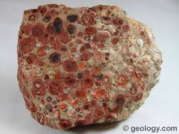Bauxite(above) is an aluminium ore and is the main source of aluminium.This form of rock consists mostly of the minerals gibbsite (aluminium hydroxide), 2 aluminium oxide hydroxides (boehmite and diaspore) in a mixture with the two iron oxides (goethite and hematite), the clay mineral kaolinite, and small amounts of anatase(one of the mineral forms of titanium dioxide).